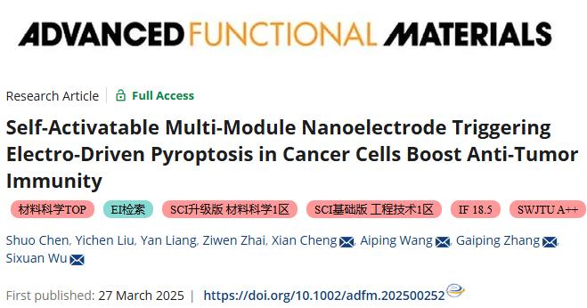 近日,龙湖现代免疫实验室和郑州大学科研团队协同攻关,成功设计出一款具备自激活特性的多模块纳米电极(简称 HMPD)。该纳米电极创新性地将谷胱甘肽(GSH)响应性电动力疗法(EDT)与Mn⟡⁺启动的表观遗传重编程相结合,可精准诱导癌细胞发生焦亡,为肿瘤免疫治疗领域提供了全新的突破性策略。相关研究成果(Self-Activatable Multi-Module Nanoelectrode TriggeringElectro-Driven Pyroptosis in Cancer Cells Boost Anti-TumorImmunity)正式发表于国际期刊《Advanced Functional Materials》。该期刊为中科院1区 TOP 期刊,影响因子(IF)高达 18.5,充分彰显了此项研究在国际材料科学与肿瘤治疗交叉领域的重要学术价值。