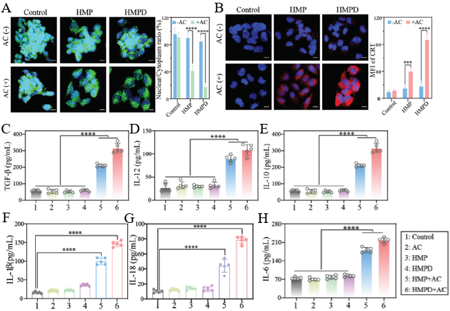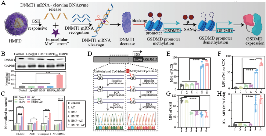 深入研究表明,HMPD 纳米电极诱导癌细胞焦亡的工作机制可分为两个紧密衔接的步骤,形成高效的 “双重激活 - 协同杀伤” 模式:首先,癌细胞内高浓度GSH触发HMNFs分解,暴露PtNCs并在交流电作用下催化水生成·OH,引发线粒体氧化应激,激活NLRP3炎症小体和Caspase-1,切割GSDMD形成打孔蛋白(N-GSDMD),导致细胞膜破裂并释放促炎因子。随后,释放的Mn⟡⁺作为辅酶激活DDzymes,特异性切割DNA甲基转移酶1(DNMT1)的mRNA,减少其蛋白表达,从而解除GSDMD启动子的高甲基化抑制,显著提高癌细胞内GSDMD水平,进一步增强焦亡敏感性(图3)。