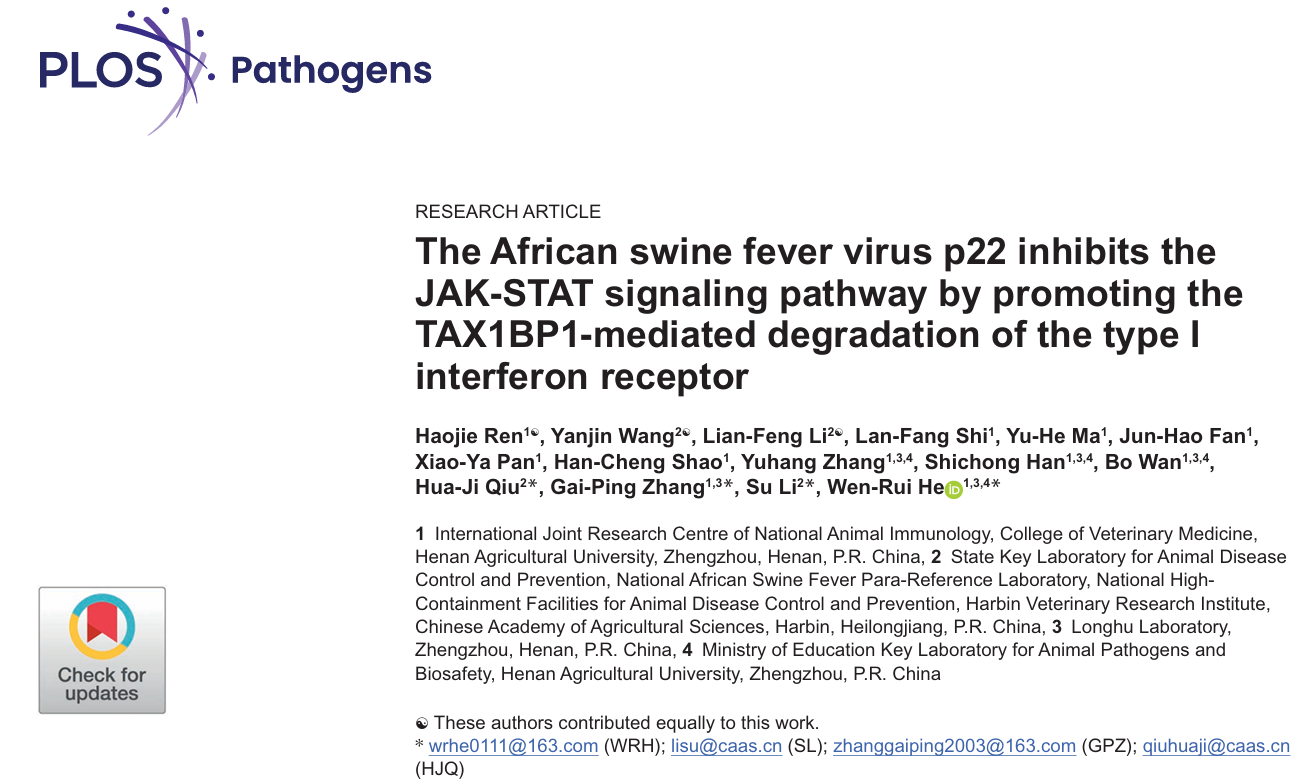 近日,龙湖现代免疫实验室在非洲猪瘟病毒免疫逃逸机制研究中取得重大进展。团队首次揭示病毒蛋白p22通过劫持宿主自噬系统降解干扰素受体,从而逃避免疫攻击的全新机制,为开发新型非洲猪瘟疫苗和抗病毒药物提供了关键靶点。相关研究成果“The African swine fever virus p22 inhibits the JAK-STAT signaling pathway by promoting the TAX1BP1-mediated degradation of the type I interferon receptor”发表在《PLOS pathogens》(10.1371/journal.ppat.1013319)期刊上(中科院一区,TOP)。