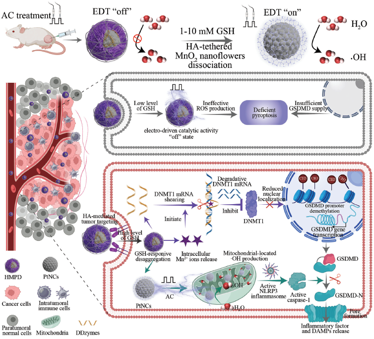 从结构设计来看,HMPD 纳米电极采用先进的 “核-壳” 结构,以铂纳米簇(PtNCs)电催化模块为核心,外层包裹由透明质酸修饰的二氧化锰纳米花(HMNFs)为电屏蔽模块,并在中间层嵌入Mn⟡⁺激活的DNAzyme(DDzymes)作为表观遗传重编程模块。在正常细胞和免疫细胞中,因HMNFs的低导电性屏蔽了PtNCs的电催化活性,同时DDzymes处于失活状态;而在癌细胞高浓度GSH环境下,HMNFs可解离并释放Mn⟡⁺和DDzymes,激活电催化产生活性氧(·OH)诱导焦亡,同时通过表观遗传调控上调GSDMD表达,形成协同放大效应(图2)。