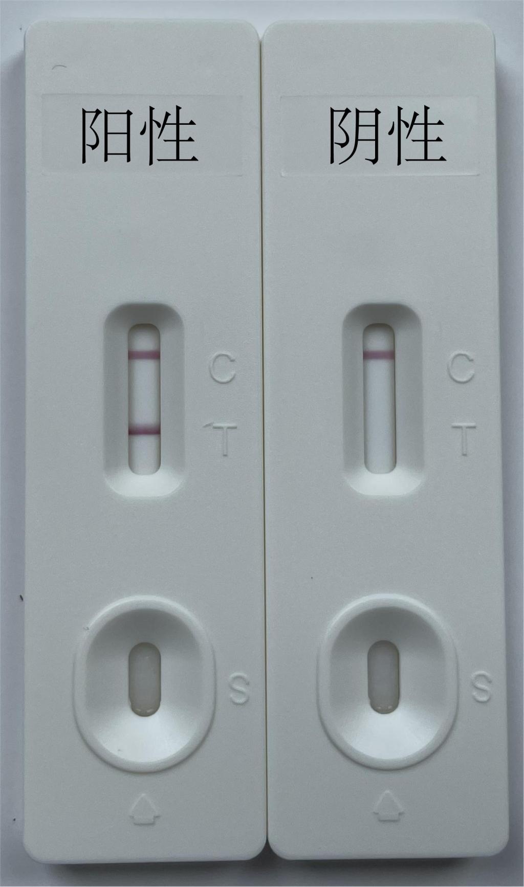 基本原理:本产品采用猪圆环病毒2型特异性抗原融合胶体金与膜免疫层析技术,检测猪血清中猪圆环病毒2型抗体。检测样品顺加样孔上移,血清中的猪圆环病毒2型抗体与金标抗原结合,形成的抗原-抗体胶体金复合物被检测线拦截,呈现红色检测线(T),质控线拦截金标抗原后呈现红色质控线(C);当被检测血清中不含猪圆环病毒2型特异性抗体时,检测线不显色,只呈现红色质控线。检测结果出现两条红色反应线即为阳性;只出现一条红色质控线即为阴性。