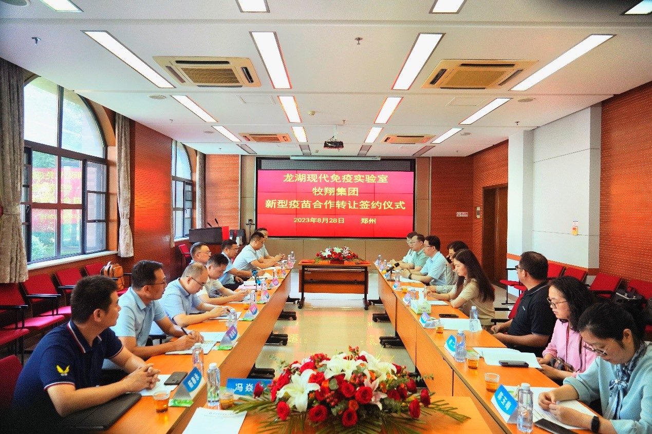 2023年8月28日上午,龙湖现代免疫室与河南牧翔集团疫苗合作转让签约仪式在河南郑州举行。河南牧翔集团董事长申贵章先生、总裁郑宝振先生及团队代表、股东代表,龙湖现代免疫实验室主任张改平院士、副主任王爱萍教授、部门负责人和团队主要研究成员代表出席签约仪式,签约仪式由王选年教授主持。